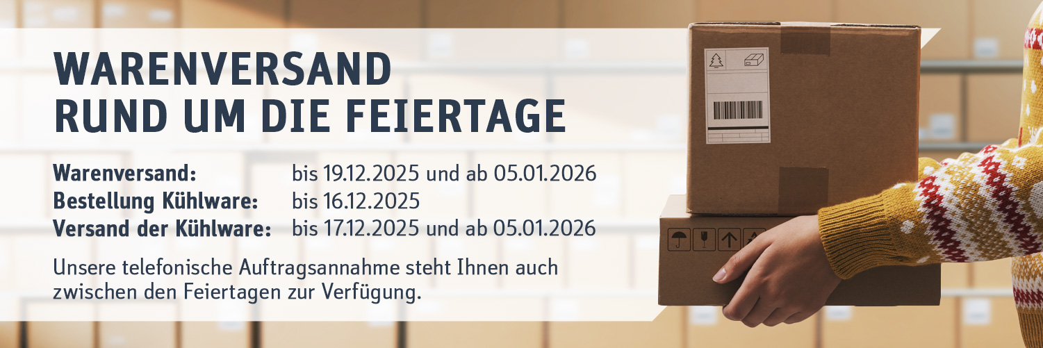 | Versand der Kühlware | bis 17.12.2025 und ab 05.01.2026 |